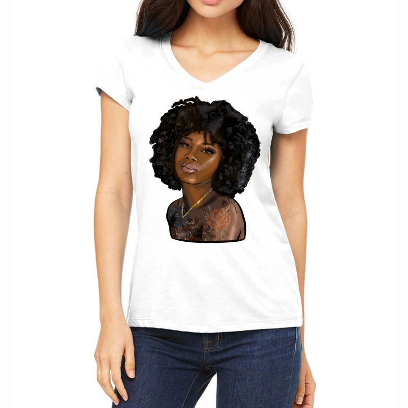 Digital printing is an amazing process that involves your artwork “Afro Lady” being processed by a computer and then printed directly onto the surface of your product. Digital printing is not a heat transfer or applique, as the ink directly adheres to the fabric of your shirt. Each printing process has its strengths, and our artwork team will weigh these when deciding which to use for your art.