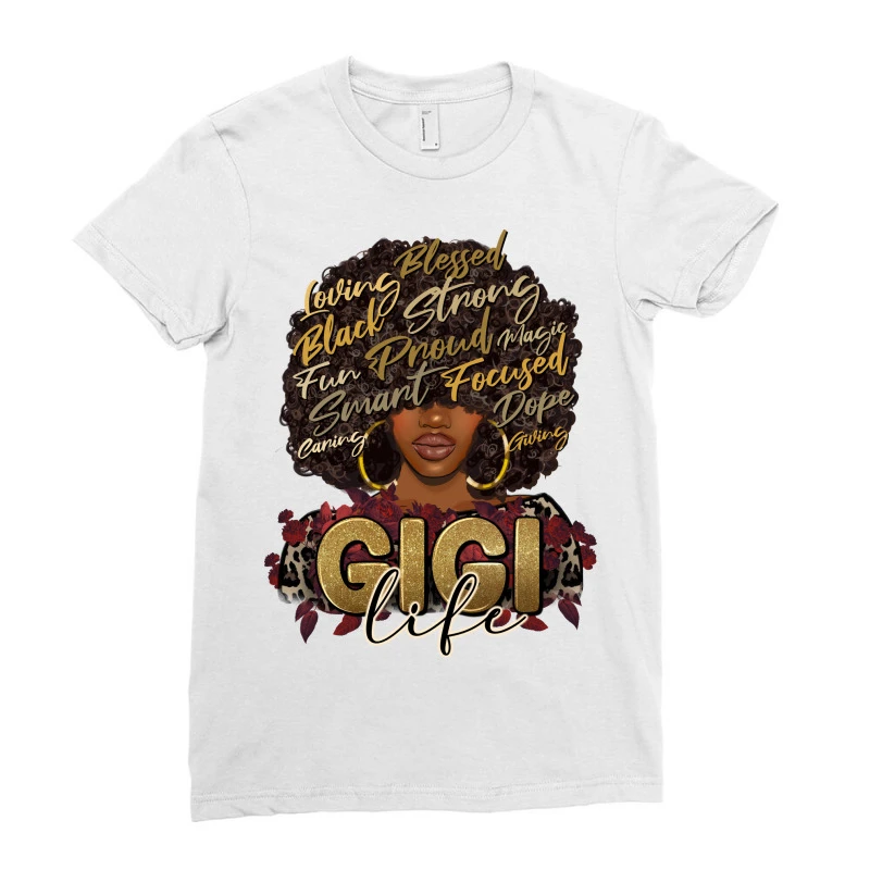 Digital printing is an amazing process that involves your artwork “Afro Woman Gigi Life” being processed by a computer and then printed directly onto the surface of your product. Digital printing is not a heat transfer or applique, as the ink directly adheres to the fabric of your shirt. Each printing process has its strengths, and our artwork team will weigh these when deciding which to use for your art.
