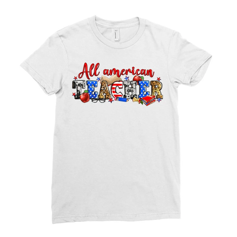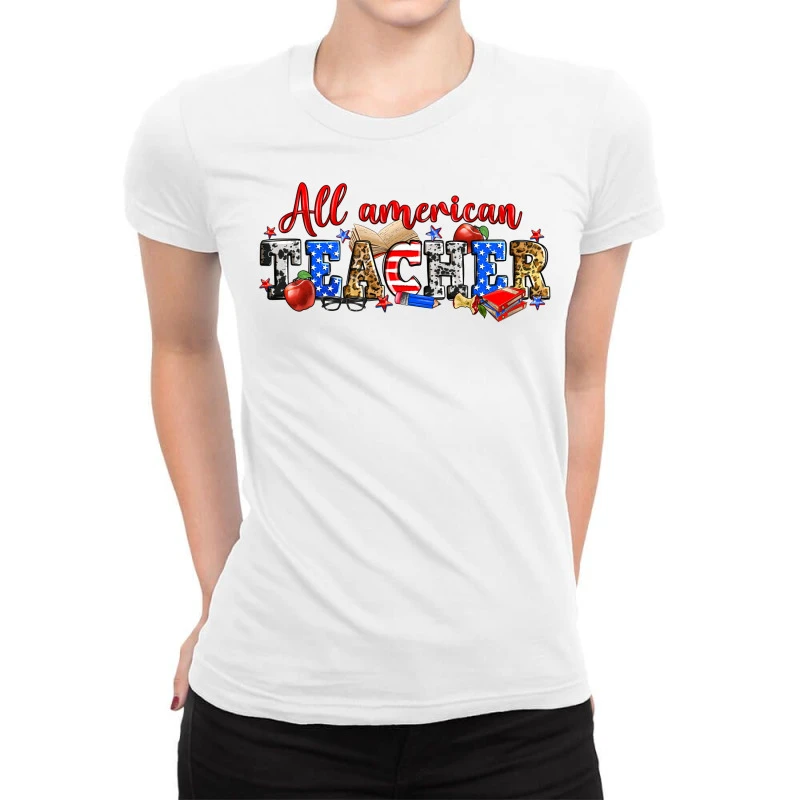 Digital printing is an amazing process that involves your artwork “All American Teacher” being processed by a computer and then printed directly onto the surface of your product. Digital printing is not a heat transfer or applique, as the ink directly adheres to the fabric of your shirt. Each printing process has its strengths, and our artwork team will weigh these when deciding which to use for your art.
