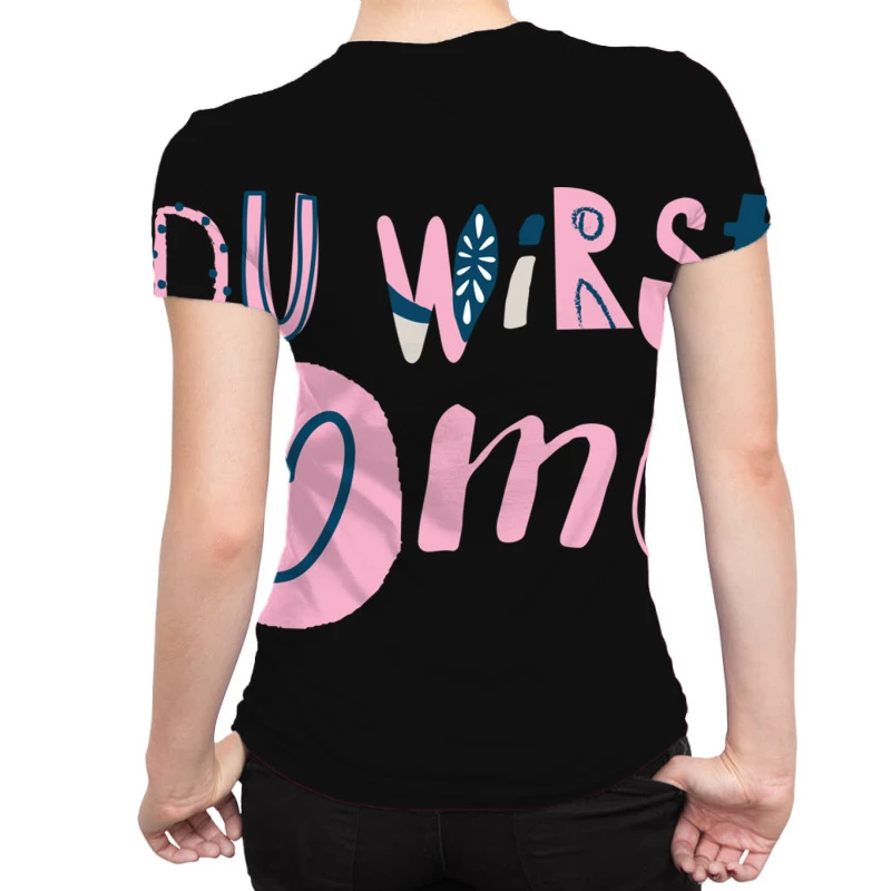 Sublimation is a process of printing to fabric (and other substances) that provides the best quality, most durable printing option. In sublimation, the inks are fused into the fabric as opposed to sitting on top of the basic such as in inkjet or screen printing. The process not only gives fabrics a softer touch after the printing, but it is also very durable. The color remains strong in outdoor lighting and after extensive washing so it’s the ideal process for All Over Women’s T-Shirt.