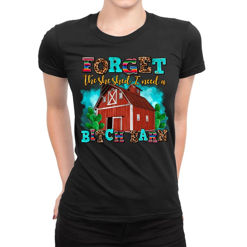 Digital printing is an amazing process that involves your artwork “Forget The She Shed I Need A Bitch Barn” being processed by a computer and then printed directly onto the surface of your product. Digital printing is not a heat transfer or applique, as the ink directly adheres to the fabric of your shirt. Each printing process has its strengths, and our artwork team will weigh these when deciding which to use for your art.