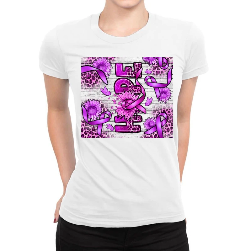 Digital printing is an amazing process that involves your artwork “Hope Purple Ribbon” being processed by a computer and then printed directly onto the surface of your product. Digital printing is not a heat transfer or applique, as the ink directly adheres to the fabric of your shirt. Each printing process has its strengths, and our artwork team will weigh these when deciding which to use for your art.