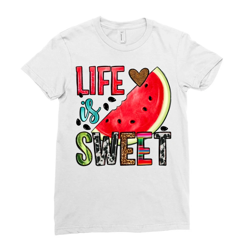 Digital printing is an amazing process that involves your artwork “Life Is Sweet” being processed by a computer and then printed directly onto the surface of your product. Digital printing is not a heat transfer or applique, as the ink directly adheres to the fabric of your shirt. Each printing process has its strengths, and our artwork team will weigh these when deciding which to use for your art.