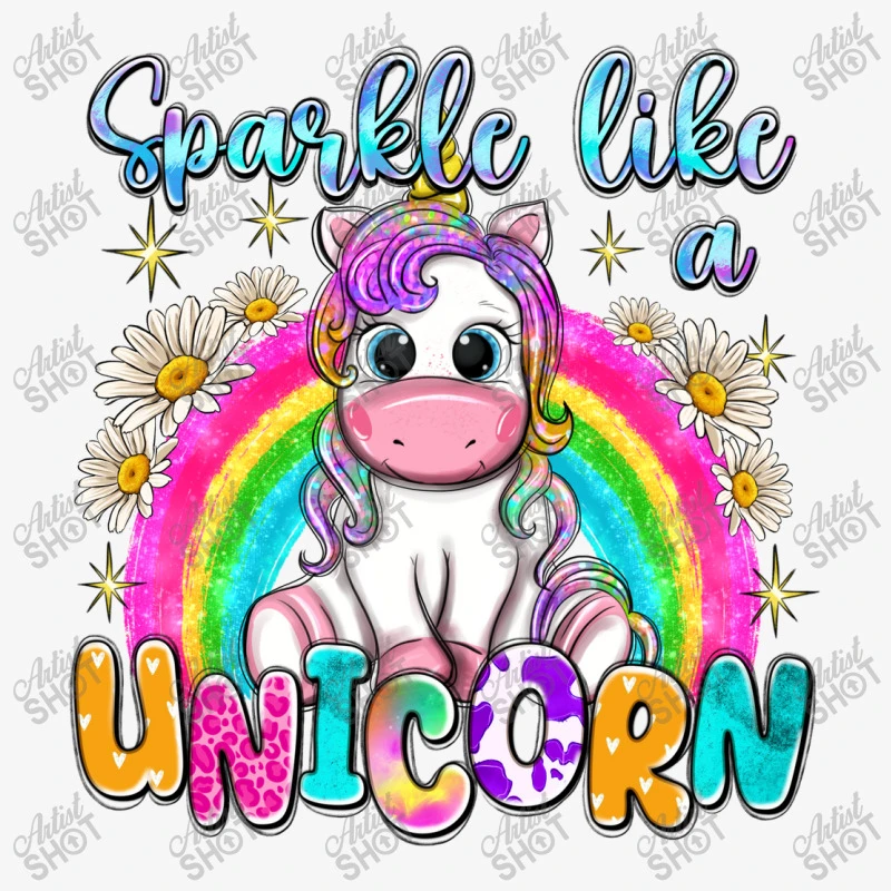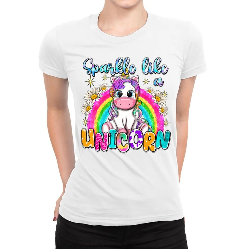 Digital printing is an amazing process that involves your artwork “Sparkle Like A Unicorn” being processed by a computer and then printed directly onto the surface of your product. Digital printing is not a heat transfer or applique, as the ink directly adheres to the fabric of your shirt. Each printing process has its strengths, and our artwork team will weigh these when deciding which to use for your art.