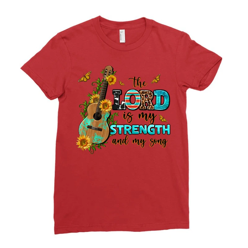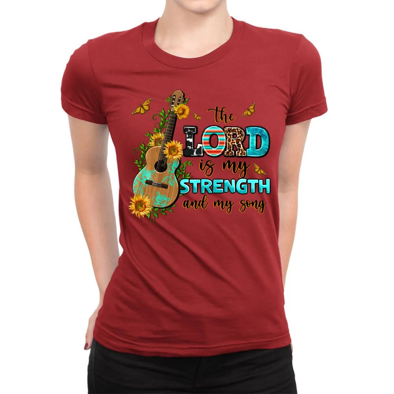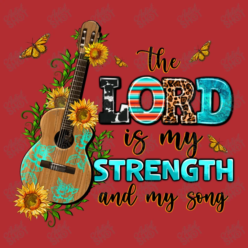 Digital printing is an amazing process that involves your artwork “The Lord Is My Strength And My Song Guitar With Su” being processed by a computer and then printed directly onto the surface of your product. Digital printing is not a heat transfer or applique, as the ink directly adheres to the fabric of your shirt. Each printing process has its strengths, and our artwork team will weigh these when deciding which to use for your art.