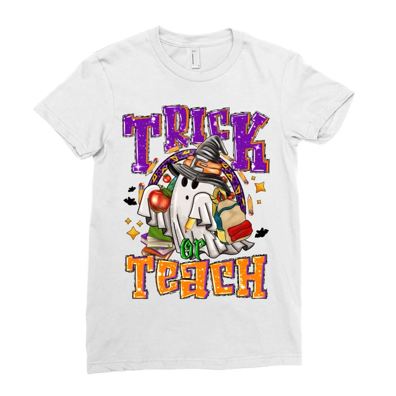 Digital printing is an amazing process that involves your artwork “Trick Or Teach Halloween” being processed by a computer and then printed directly onto the surface of your product. Digital printing is not a heat transfer or applique, as the ink directly adheres to the fabric of your shirt. Each printing process has its strengths, and our artwork team will weigh these when deciding which to use for your art.