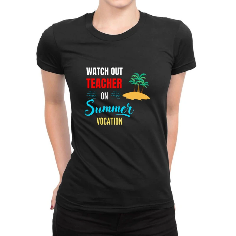 Digital printing is an amazing process that involves your artwork “Watch Out Teacher On Summer Vocation Funny” being processed by a computer and then printed directly onto the surface of your product. Digital printing is not a heat transfer or applique, as the ink directly adheres to the fabric of your shirt. Each printing process has its strengths, and our artwork team will weigh these when deciding which to use for your art.