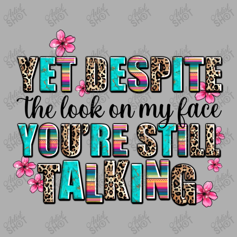 Digital printing is an amazing process that involves your artwork “Yet Despite The Look On My Face You Are Still Talk” being processed by a computer and then printed directly onto the surface of your product. Digital printing is not a heat transfer or applique, as the ink directly adheres to the fabric of your shirt. Each printing process has its strengths, and our artwork team will weigh these when deciding which to use for your art.